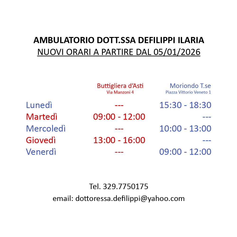 Si comunica che a partire da Lunedì 5 Gennaio 2026, l'orario di ricevimento della dottoressa Defilippi subirà una variazione.